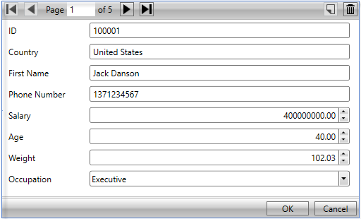 List<Customer> data = new List<Customer>(); data.Add(new Customer("100001", "United States", "Jack Danson", 40, 102.03, Occupation.Executive, "1371234567", 400000000)); data.Add(new Customer("100002", "China", "Tony Tian", 32, 82.2, Occupation.Engineer, "1768423846", 500)); data.Add(new Customer("100003", "Iran", "Larry Frommer", 15, 40.432, Occupation.Artist, "8473637486", 600)); data.Add(new Customer("100004", "Germany", "Charlie Krause", 26, 69.32, Occupation.Doctor, "675245438", 700)); data.Add(new Customer("100005", "India", "Mark Ambers", 51, 75.45, Occupation.Other, "1673643842", 800));