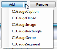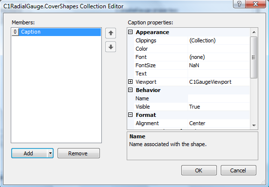 The C1Gauge.CoverShapes Collection Editor, C1LinearGauge.CoverShapes Collection Editor, and C1RadialGauge.CoverShapes Collection Editor allow you to add, remove, and edit items in the CoverShapes collection. You can access the CoverShapes Collection Editor by clicking the ellipses button next to the CoverShapes item in C1Gauge, C1LinearGauge, or C1RadialGauge's Properties window.