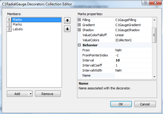 The C1LinearGauge.Decorators Collection Editor and C1RadialGauge.Decorators Collection Editor allow you to add, remove, and edit items in the Decorators collection. You can access the Decorators Collection Editor by clicking the ellipses button next to the Gauges property in the Properties window and then clicking the ellipsis button next to the Decorators property.
