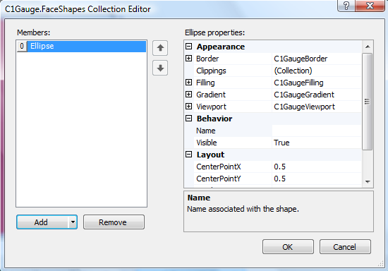 The C1Gauge.FaceShapes Collection Editor, C1LinearGauge.FaceShapes Collection Editor, and C1RadialGauge.FaceShapes Collection Editor allow you to add, remove, and edit items in the FaceShapes collection. You can access the FaceShapes Collection Editor by clicking the ellipses button next to the FaceShapes item in the C1Gauge, C1LinearGauge, or C1RadialGauges Properties window.