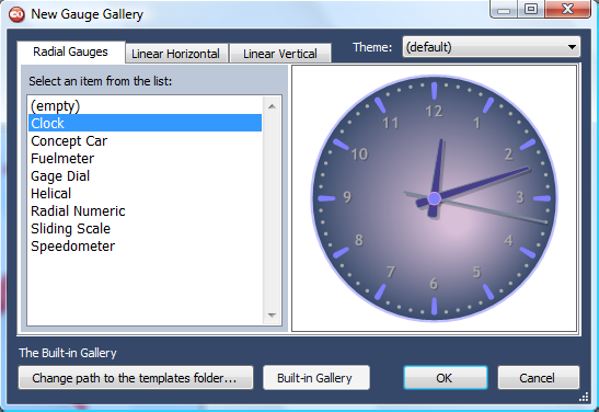 Select the C1Gauge control in your project and click the smart tag. Select Add New Gauge from the C1Gauge Tasks menu. The New Gauge Gallery dialog box appears, allowing you to pick and choose templates and themes: