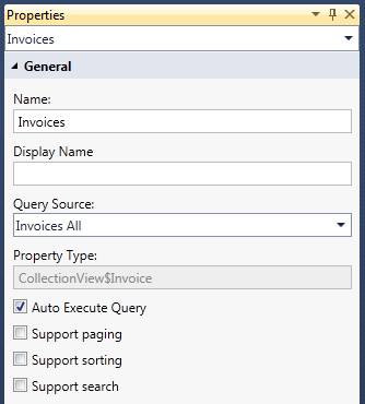 When configuring a LightSwitch collection view, paging is turned off by default. Select the data source (Invoices) in the Properties window and clear the check boxes for sorting, and search, but keep the box named Auto Execute Query checked.