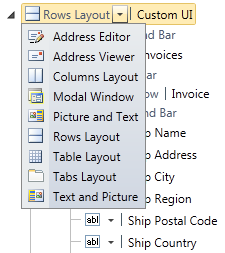 Start by adding a new screen using an appropriate screen template. An Editable Grid Screen is a good choice because it contains a single data collection and a minimal number of UI elements to replace. In this example, the screen was renamed to CustomUI and its data source was set to the Invoices collection. In the designer, select the dropdown menu for the root element (Rows Layout) and change it to Columns Layout.