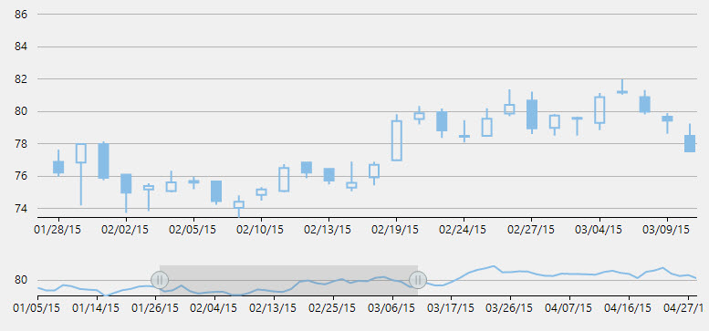 <Grid Background="{ThemeResource ApplicationPageBackgroundThemeBrush}"> <Grid.RowDefinitions> <RowDefinition /> <RowDefinition x:Name="row" Height="100" /> </Grid.RowDefinitions> <Chart:C1FinancialChart x:Name="candlestickChart" BindingX="date" Binding="high,low,open,close,volume" ChartType="Candlestick" ItemsSource="{Binding Data}"> <Chart:FinancialSeries /> </Chart:C1FinancialChart> <Chart:C1FinancialChart x:Name="financialChart" BindingX="date" Binding="close" ChartType="Line" ToolTip="{x:Null}" Grid.Row="1" ItemsSource="{Binding Data}"> <Chart:FinancialSeries /> </Chart:C1FinancialChart> <Extension:RangeSelector x:Name="rangeSelector" Grid.Row="1" ParentChart="{Binding ElementName=financialChart}" ValueChanged="OnRangeSelectorValueChanged" Margin="20 10 0 10" /> </Grid>