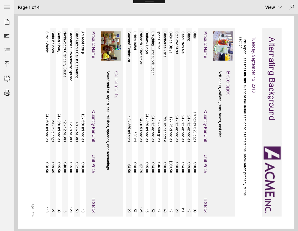 FlexViewer provides you the flexibility to rotate the view of reports to different angles according to your requirements. To rotate view of a report to various degrees of rotation, you can set the RotateView property of C1FlexViewer class. The RotateView property accepts the following values from the FlexViewerRotateView enum describing the rotation angle of the view: